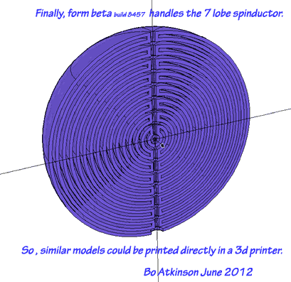 Below: The "spiraling sphere" above has been adapted as as an electrical inductor, hense "spinductor". The shell like structure above, is used as an electrical conductor. Other adaptions are also under consideration.