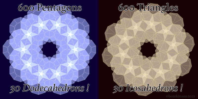 Mathematical meditation in the mind's eye inspired visual modeling, and also guided structural experimentation. Platonic solids as described are hylozoically Pythagorean introductions given to Platon, (or Plato is an Anglicized spelling). So regular and efficient is computer generated geometry, but how can precisely attached 3d clusters naturally light up pentagonal-stars? How and why? Is this only virtual lighting undiscoverable in crystallography or elsewhere? (Dialog is welcome).