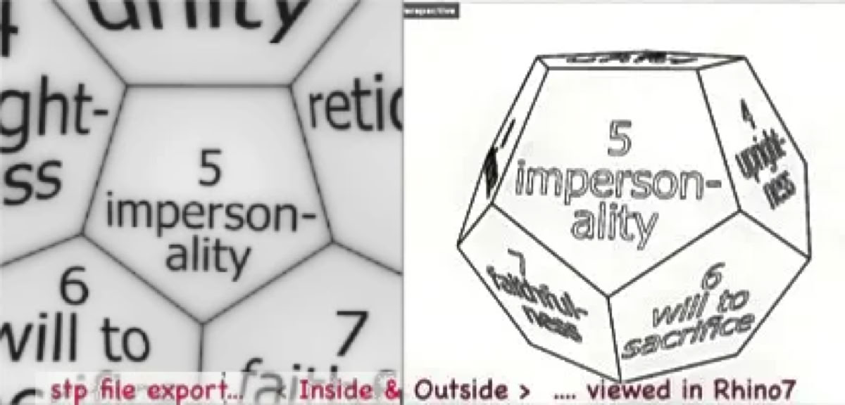 A 3d physical printing file was modeled, (which opened in Rhino 7 as a test of transferability, meaning that a 3d print shop might print it for an individual customer). It has recessed labels on the solid dodecahedron shell and is an elaborate test idea to try out versions, even with knobs added.