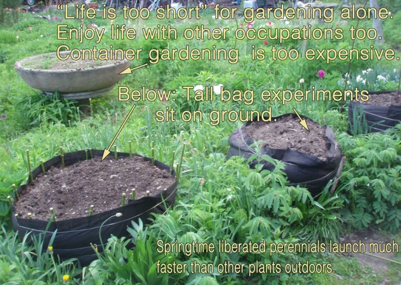 I spent 8 years investigating minimalist but productive food gardening, but more as a prototyper of my own lifestyle. Here is a researched gardening outcome which saved me time and labor efforts. Plant crops or delicate plants directly amidst aggressive perennial areas! Some would demand removal of these aggressive perennials. Others of us feel the need to strive for newer harmonious solutions. Lightly prune the most aggressive, tall thick stemmed, overgrown perennials, starting in the late summer.
