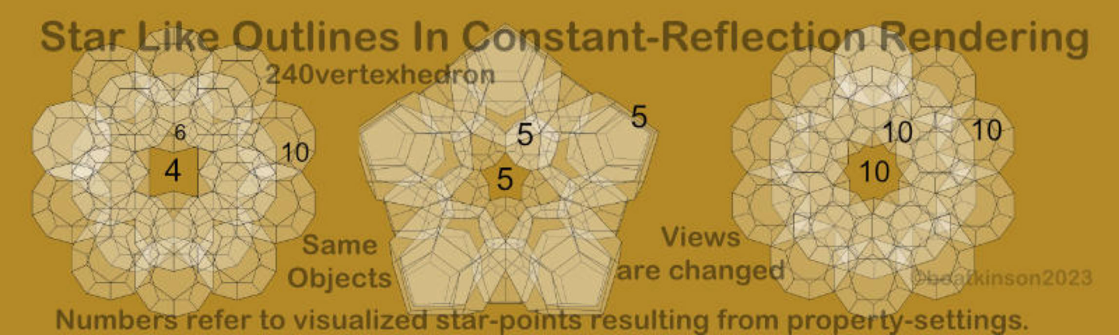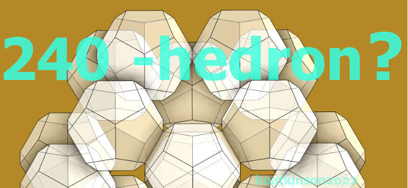 Originally, the 240hedon and 360 hedron were modeled by moving and snapping center points placements of smaller sized dodecahedra with a tool which cloned each copy as it was moved into place. Following that, just one dodecahedron was upscaled in size as all copies simultaneously grew in size. The manual scaling toolcould simply click on the midpoint of the activated tetrahedron and drag it towards the approaching cloned- dodecahedron, (to snap on its midpoint).