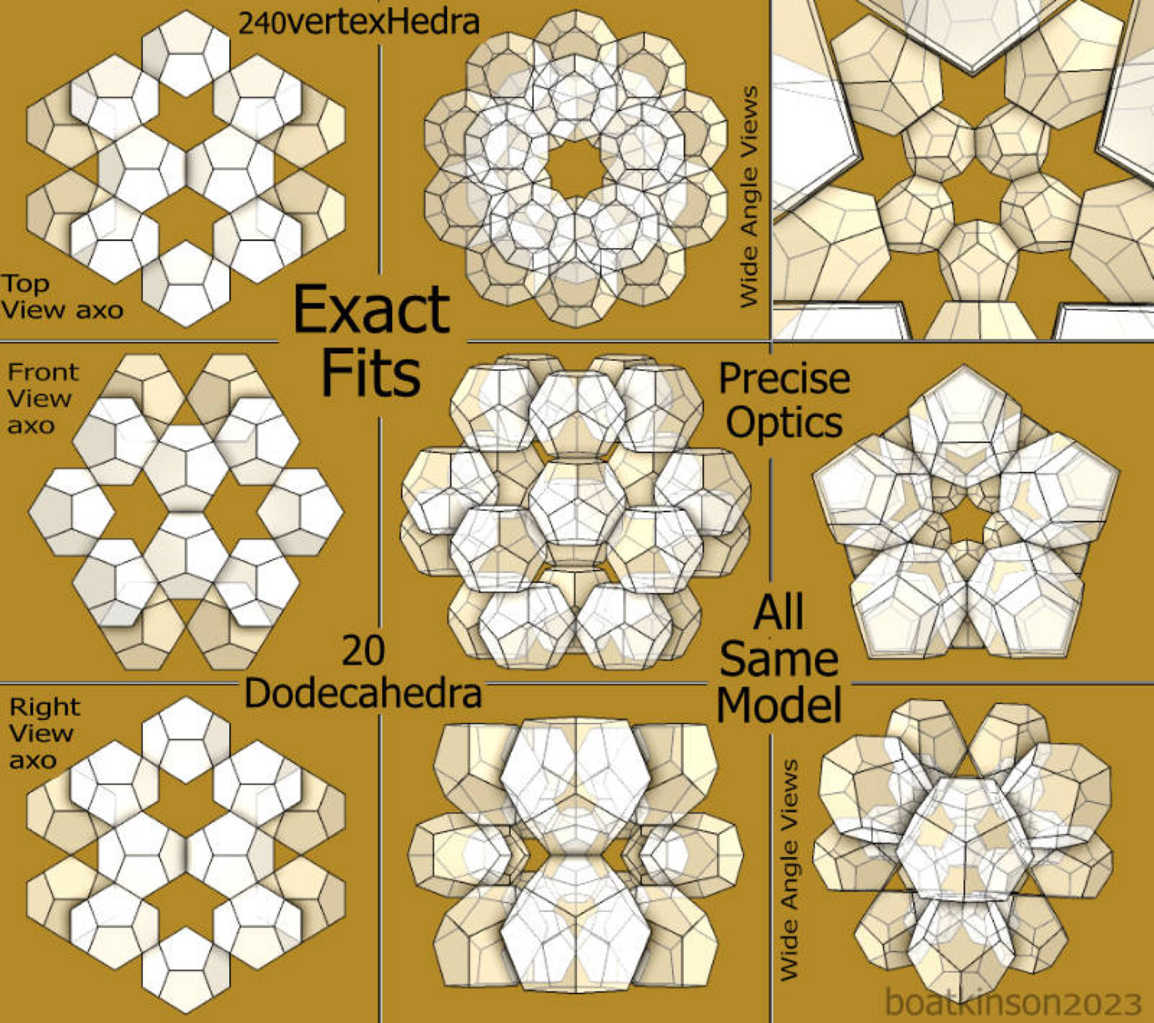 Originally, the 240hedon and 360 hedron were modeled by moving and snapping center points placements of smaller sized dodecahedra with a tool which cloned each copy as it was moved into place. Following that, just one dodecahedron was upscaled in size as all copies simultaneously grew in size. The manual scaling toolcould simply click on the midpoint of the activated tetrahedron and drag it towards the approaching cloned- dodecahedron, (to snap on its midpoint).