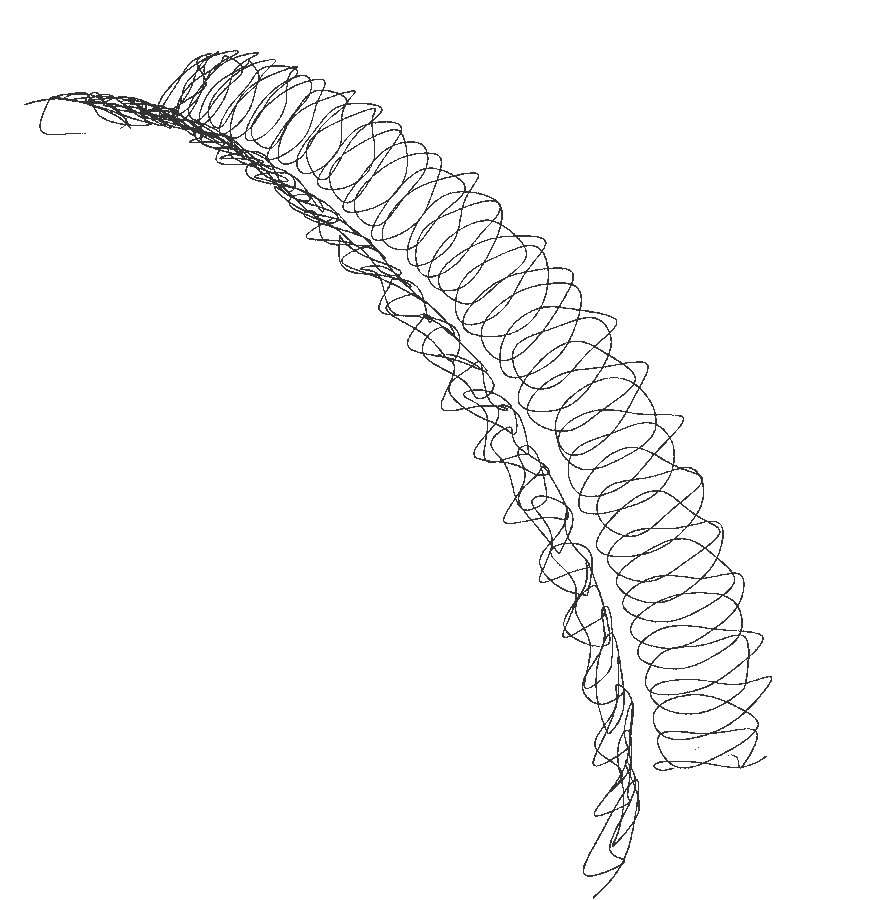Black rings above portray a truss like layout of undulating rings. The truss itself undulates, following the scalloping contours. Heavier bars are represented by the straighter black lines in the picture below.The outermost edges of the truss ride on the top of the coffers and the inner edge of the truss at the backbone juncture. This explores ferrocement design methods to integrate truss work and ceilings in one unified component. Computer models are available and offered free for the purpose of engineering analysis.