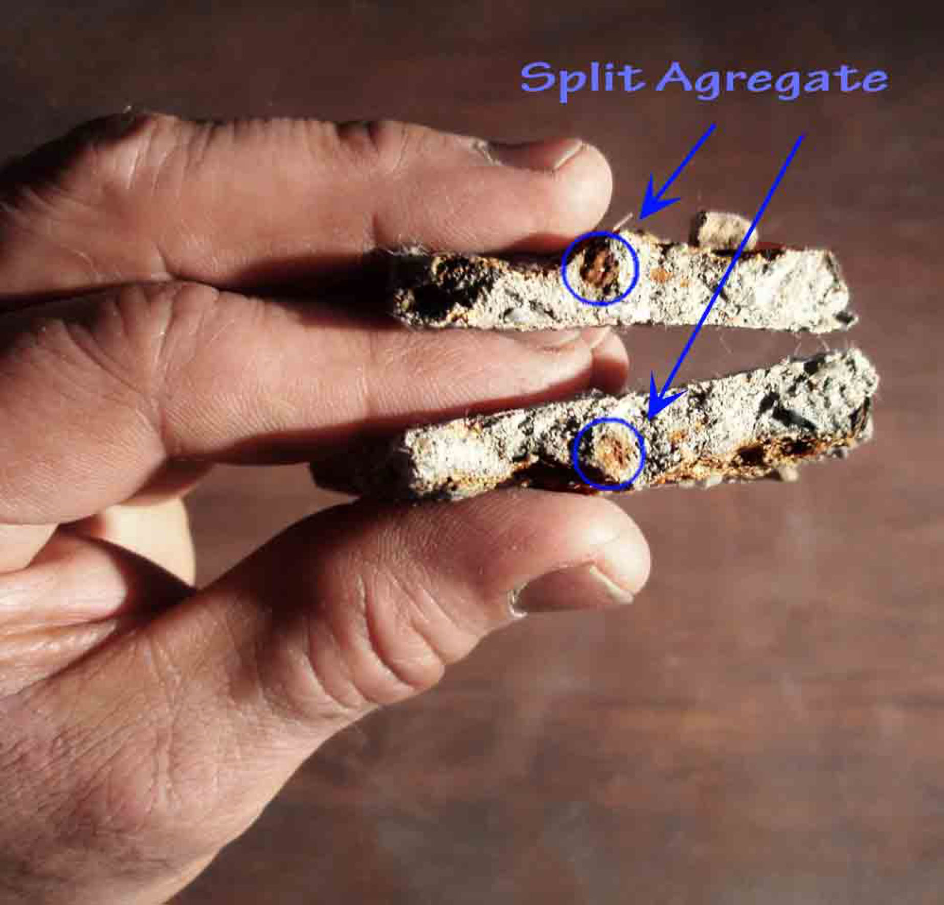 Next Above is the exposed fracture. Note the blue circles in which a piece of stone aggregate (pebble) has been itself split. This signifies that the cured cement is stronger than that piece of aggregate. There were some small slit pebbles which were likely quartz is generally fairly strong among stones, a good sign we should appreciate.