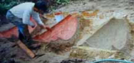 The simple earth molding method described here provides a healthy mix of physical exercise and probably just the right amount of employment if you need income. Sculptural work can exercise the human body in a balanced way, so that we don't over repeat the same identical actions too often. I love opportunity to work with flowing and rounded shapes. The least lovable parts for me were mixing cement and selling products. Nevertheless, considering that I work and live far from good sales locations, the business was still very favorable. Mixing dusty cement outdoors or with exhaust fan allows some avoidance of the dust since the dust cloud can be seen and avoided. But someday, getting a bin system or half ton bag system with mechanized metering of mixes, would sure be nice. I especially dislike the cement dust. It should not be so hard for a manufacturer to supply low cost, reliable metering equipment, just right for the small user. In time I might improvise my own. This would boost my production way up, and my spirit also ;)I love simple sand molds because little time and material is wasted while the environment and worker are less taxed. The sand holds moisture for desirable cement curing. Mold and product are separated easily and brushed off later on. Sand is recycled anew, just add water. This system adapts both indoors and outside, in a tent, or in the sun. All ambient conditions have advantages and cautions to learn about.