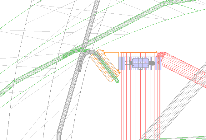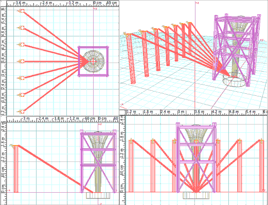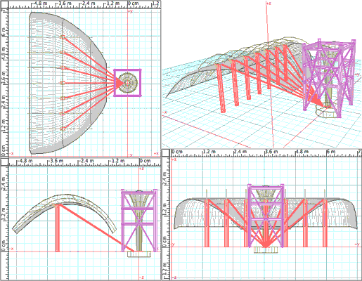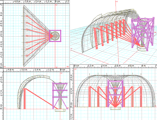 The first picture below illustrates the pivoting framework in red. The purple scaffolding supports forms for the column at vault center. (Colors are for diagrammatic purposes only.)