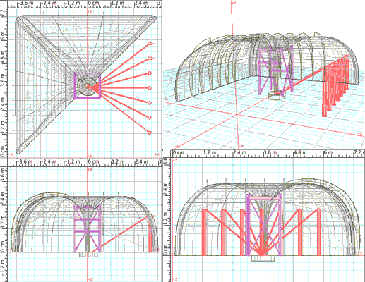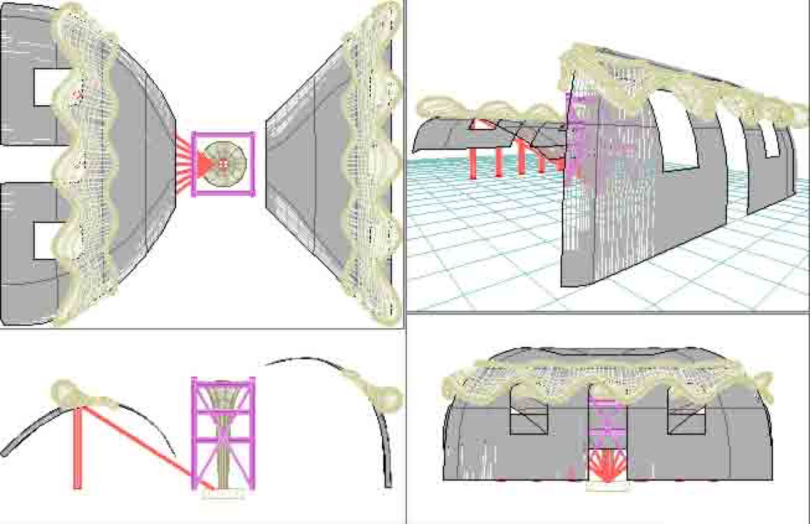 Above: Windows, doors and sky lights and more are suggested in blue surface geometry. (Color scheme does change in the following pictures, due to gradual updates of the concept.) Below: Green-sandwich construction is achieved with a permanent gravity-bond. Wall and acrch top are integrated along with insulation, (purple color). The insulation is "sandwiched" between to thin concrete layers. The sandwhich unit can be poured in one day. (Insualtion can be prepared in advance from laminated styrofoam sheets. Laminated styrofoam bends to arch.) Component thicknesses and specifications are highly variable, to satisfy engineering requirements, (by a local engineer).