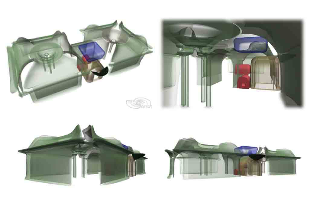 The example above adapts heavy should show that pillars can multitask. I love CAD modeling but almost always have priorities. Besides thermal moderation, many functional fixtures can be integrated within the pillars. Truly green construction would benefit with generous water storage cisterns held high for gravity flow. (More examples should be added here in future.) Much thinner pillar supports could otherwise work, where lightweight loads are preferred. Emphasis is on the widely flaring capitals on the pillar tops. Large capitols can morph into arches and vault work overhead. Hence an array of circulating barrel vaults on pillas. Also lacking in my CAD models here, is the consideration of frameworks, to strengthen interior surfaces. Perhaps some materials could pass strength tests, as drawn. Yet for average Portland mixes, i believe frame works or integral pilisters make sence. Otherwise coffers fashioned into shelf space or integral cabinets could also provide this sort of added reinforcement. Integrated building components make the most sence to me, but also require much more modeling time. I felt it worthy to present this simpler modeling, just to open a dialog on the subject. This type of structure also can be completely integrated with green HVAC.