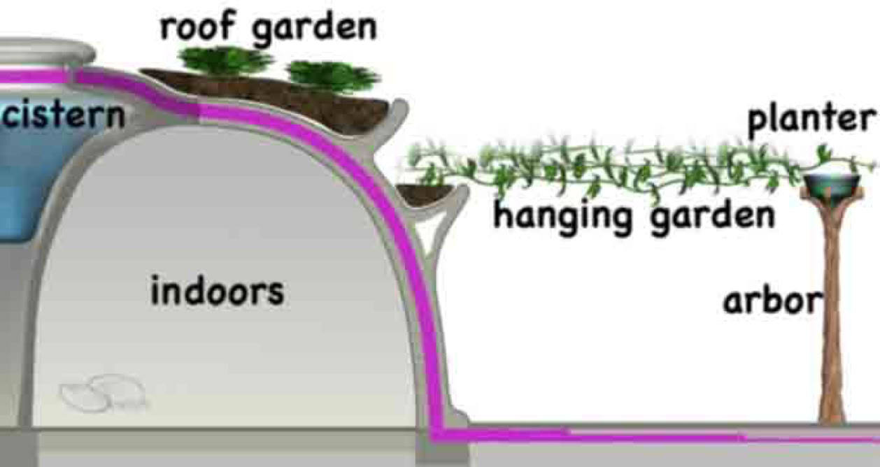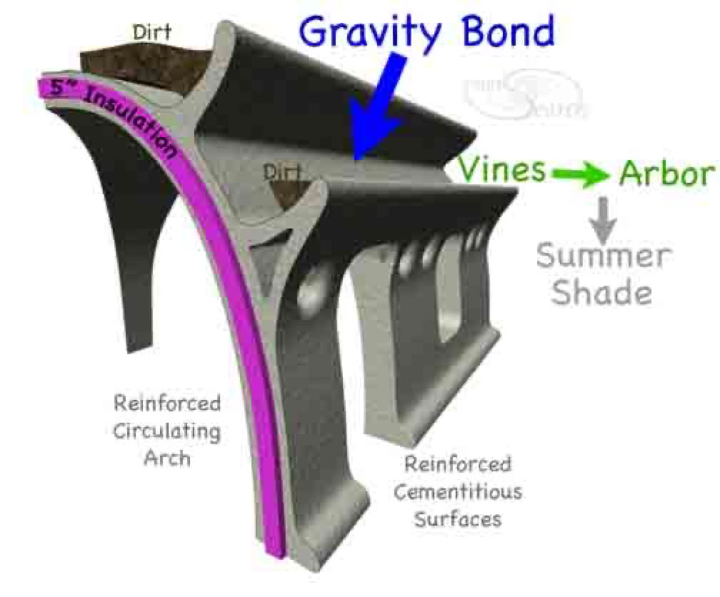 The use of arches and pillars is advantageous where gravel and other supplies are plentiful. Each region favors particular material uses. In some cases, stony masonry or recycled brick might be advantageous. Recycled rubble from demolition debris might be appropriate for building with sticky concrete mixes. Reducing transportation costs will reduce building costs. Concrete can reduce flammability. Renewable bio-composites and selective admixtures can reduce planetary toxicity. High end, so called ductile composites (or Engineered Cementitious Composites, ECC), can reduce the total building mass. Whilst desirable thermal mass can be obtained from cisterns and the ground beneath. Reinforcement and insulation availability also varies according to geographic regions.The objective of this circular barrel vault module is to carefully integrate many efficient and desirable design criteria.