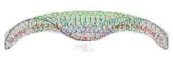 Vaults made large and flat ,(clear spans), would require a more expensive truss reinforced roof (in black). Nevertheless, engineers have developed a variety of cost efficient approaches to build trusses as economically as possible. Welded steel mass produced units have less gain on the investment than could ferrocement or composite mass production. Structural strategy would make the difference. Truss installation will generally require use of cranes which also bear costs. One objective of this page is to avoid such costs. Here is another ferrocement or composite formed truss by the author for a recurve-cable-truss, based on ferrocement coiled-meshes. It may compete with other truss beams by using less material for the same performance. (Or provide more performance for the same cost).