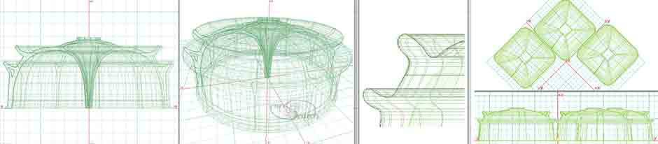 Note that four columns are provided at center to somewhat reduce the longer diagonal span. Longer, clear spans would necessitate more expensive reinforcement. Therefore, shortening this span will effectively reduce the amount of reinforcement material needed to achieve the same amount of support. Next below is a model which integrates a wood-fired masonry-heater sandwiched between 2 square donuts. The idea here is to use solid concrete walls to hold refractory furnace components in an earthen aggregate. Also featured are sky lights at the mitered square donut joints. Such skylights would simplify the learning and exploration efforts.