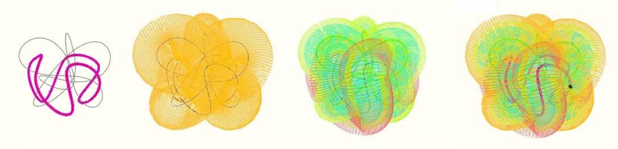 These concepts simultaneously explore universe mechanisms as well as imagined approaches to buildable and functional models. Ordinary coils were also "texture mapped" to polygonal surfaces. My helical visualizations have always bridged multiple purposes, e.g.: bridging applications from housing to inductive fields. Below is a random example of wrapping helices or EMR coils around multi-axial paths. My built experiments like coils above are here.