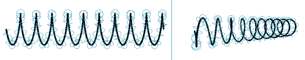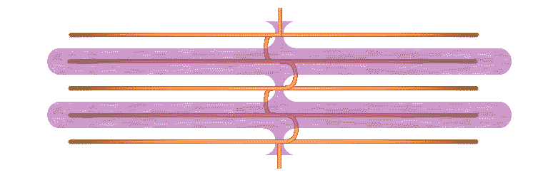 So far, this page hasnoted the profiles of coils with spacings much larger than the coil substance (wire). I emphasize the scale of spacing wires apart. The spacing locates and therefore controls the fields around the wire.Where the wires approach closer together, less space is available for fields. Leading to an interesting question: Is there a coil winding (spacing) which effectively diverts the fields, away from the wires? This is the ordinary, closely packed coil winding. The fully perpendicular, no angle view presents cylindrical coils as all zigzag, no loops: