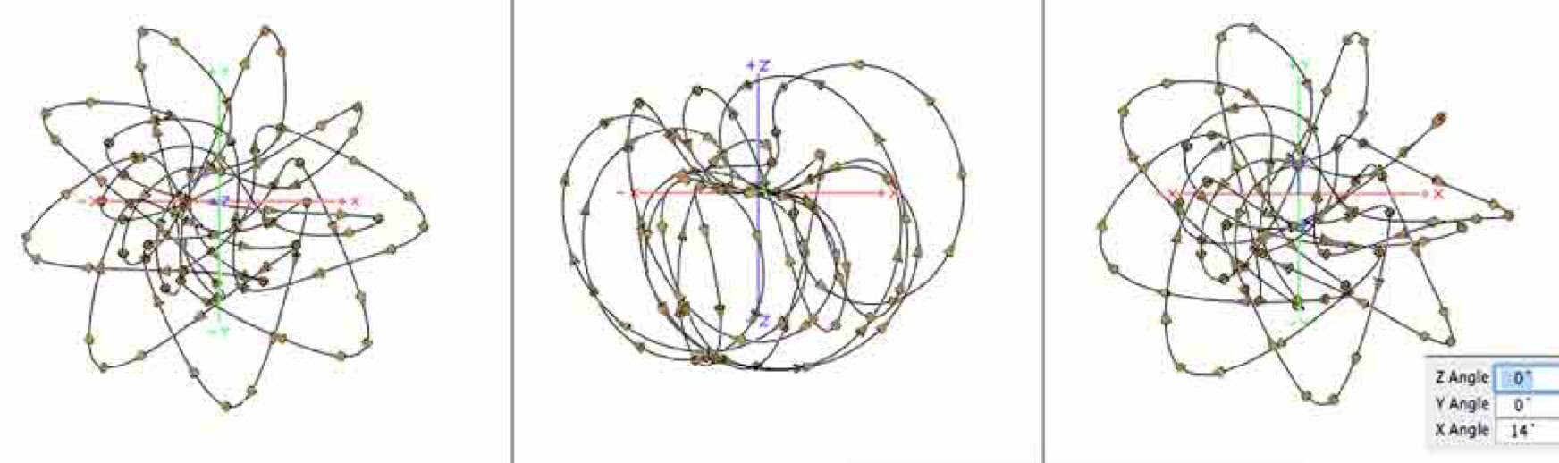 This is a complex coil wound around sphere. The software Clipping Planes manage to isolate the view of one turn. I model these paths to help formulate buildable experiments. Regardless whether the production setup is ever kick started.The polyhedrons provide endless outlines for energizing new field patterns. One of my favorite polyhedrons is the tetrahedron. I spent a lot of time modeling and imaginingexperiments for energizing tetrahedrons and derived shapes.