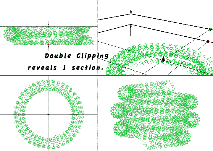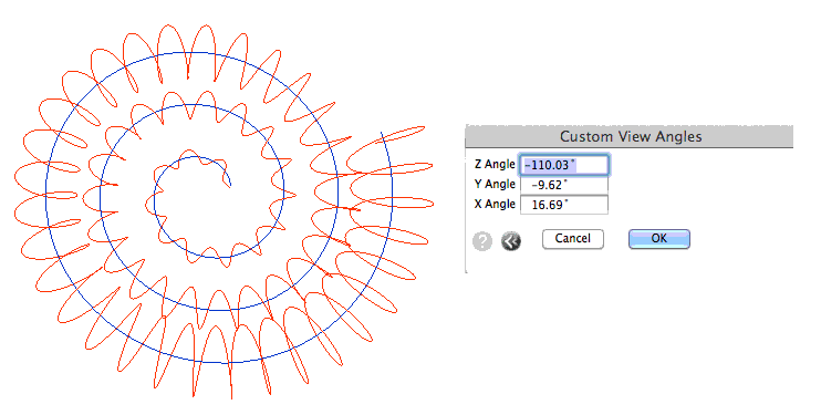 Image above: The left display is the 'Top' view, (no perspective). The center display is the front view,( no-perspective). The model display on the right reveals a sought-for, profile-imbalance. I have wondered if this suggests that recursively wound helices, actually do have usable technological implications. Should the critical attribute be named ? Let us wind a blue helix around the ordinary-spring-like helix, (of an earlier model above).