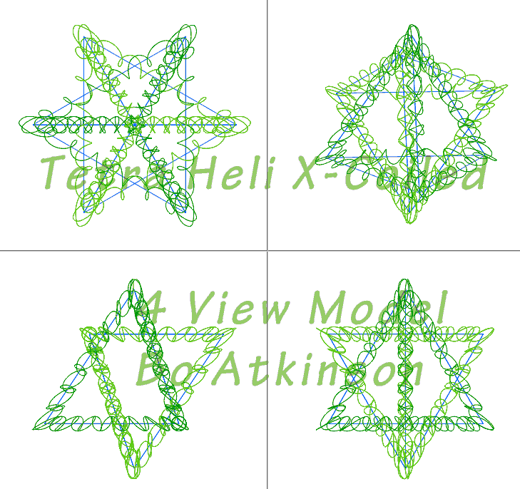 Coils structured as polyhedrons provides another area of exploration. Next below is my primordial helix combined with an inverted copy to make a star tetrahedron... Since these primal helices are themselves, in fact, facetted helices... (The startetrahedron could be made with straight bar segments.) I say that the green coils are X coils. (An older name i considered, to imply an orthogonal or circulating fields, associated with conductors).... A caduceus configuration occurs in this case, due to the closely-spaced paths. (More to be added here.)