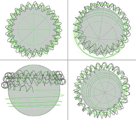 In 1992 i got my first PC (a 486 with DOS5 & Windows3.1) It took me a couple of years to acquire and learn 3D CAD software,( self trained and low budgeted). Coil visualization fascinated me and suddenly i had tools to explore new aspects of coils and combinations of helicity. Next is a graphic to show my meager attempts to "geometrically weigh" the imbalance of profile: I first tried to use vector based geometry but ended upconcluding that only raster or bit-mapped images could render the wanted profiles. However, my tracing software used to generate vector based software was lost through hardware and OS changes.So i gave up that minor aspect. I'm tired of relearning new software and paying for it. Then loosing it a few years later. I did verify the imbalances numerically, which did suggest that my assumptions of profile imbalance are valid, (geometrically measured).