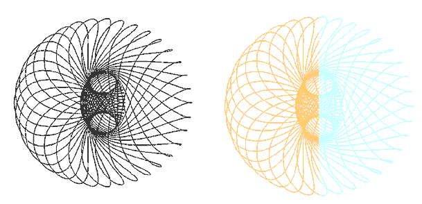 Here we show the same view angle as above, displayed on the left, (with no perspective). One significance of this view on the left is that the blue helix also bears an imbalanced profile. Though this particular imbalance occurs only at specific points along the source-path. The flat-projection of the blue helix reveals helical orthogonality. Could this correspond to magnetic lines of force or EMR patterns? Are magnetic 'lines' independent circles distributed along a conductor wire? Or could these force fields actually be helical in nature?To the right is displayed a perspective view of same model, to verify the ordinary spring-like model. I applied this helical orthogonality inter changeably in coil winding: