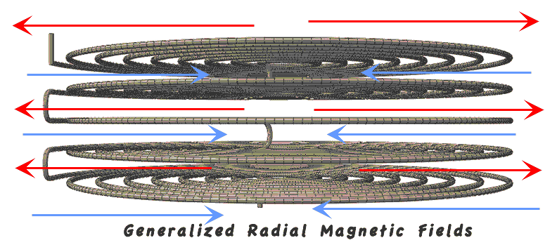 Stacked pancake coils can be arranged to produce reversing radial magnetic fields-- Closer radial-spacing of wires, but distance between pancakes, would strengthen the indicated fields. I found magnetically coated wires localizes the field characteristics per section of wire. Mutual inductance between radial turns can be isolated, where the lateral-radial turns bear opposing filed polarities-- While the pancake sections agree on filed polarities.Where pancake stack connections are as drawn below: