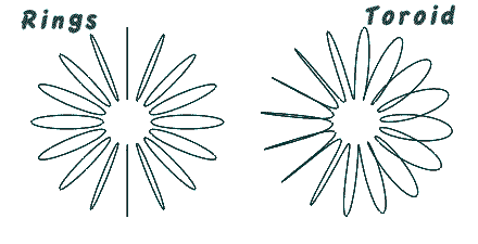 Above: Geometry render of a flat helix, scaled, with ortho-helix, also scaled. (View angle are axonometric, or without perspective ). The red extends in 3D, thereby imparting both 3D path and also a radial 'imbalance'. Next Below: A comparison of 16 rings outlining a torusand 16 turn,toroid coil. Note the balanced symmetry of the ringed torus.