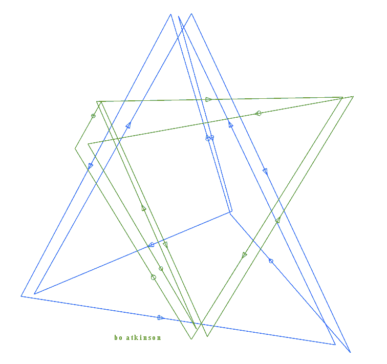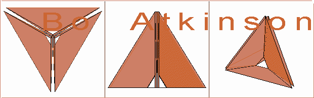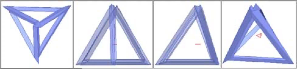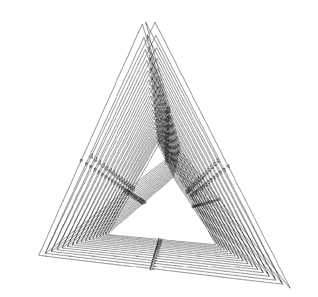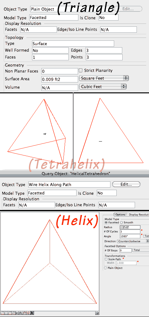 In February 2007 I modeled and observed helical structures wound around basic geometries including the equilateral triangle and by adjusting the input parameters discovered the striking resemblance to the tetrahedron, or trihedron as described above. The convergence or transmutation of two dimensional (triangles) and three dimensional structure (polyhedra) was questioned, as a hypothetical explanation, (hence the previous suggested name Primordial). The three apexes increasingly converge with the increased ratio of helix diameter to the helix path, (and structured with straight segments instead of curves). This peaked curiosity about the classification of “2d vs3d”.