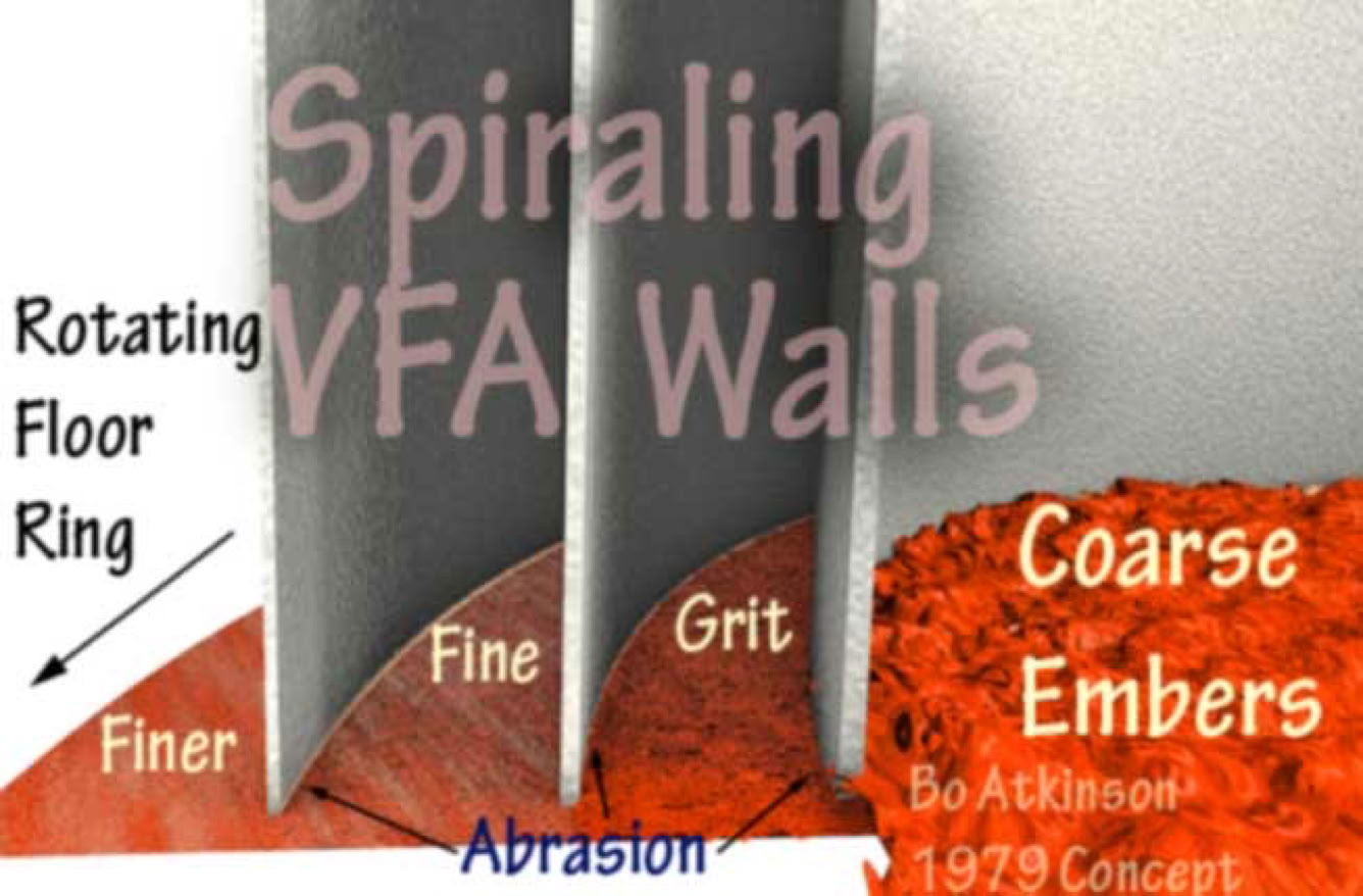 The diagram above illustrates the claim, that the spiraling VFA walls could provide a fixed-grinder-surface. With appropriate rollers, isolated from heat, below the VFA, a refractory ring could continuously turn during the burn period. Therefore the embers would tend to be scraped against the spiraling walls. An experiment was considered to see if appropriate, silica-bearing solid waste, such as rice hulls, could be combined with lime and other minerals, in order to manufacture cement.