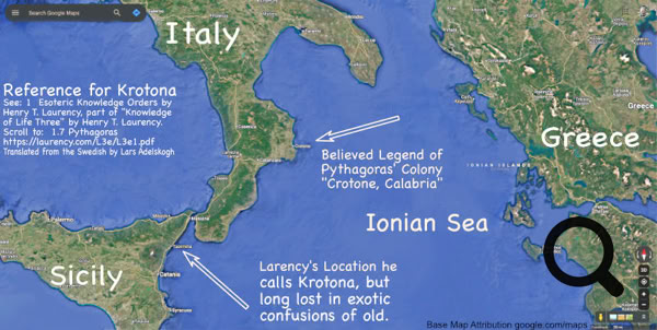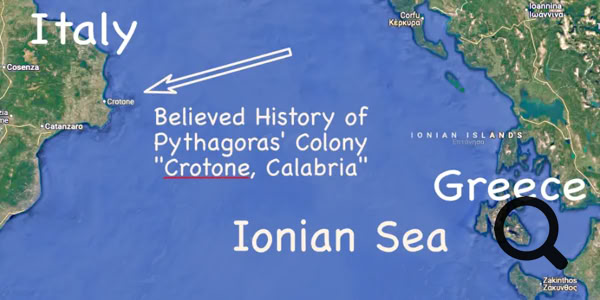 Takeaways: Pythagoras' small colony and school was utterly destroyed thousands of years ago, and the modern vicinity is viewed by arial photo, to generally see the landscape around Laurency's reference, "outside the town of Taormina in Sicily".