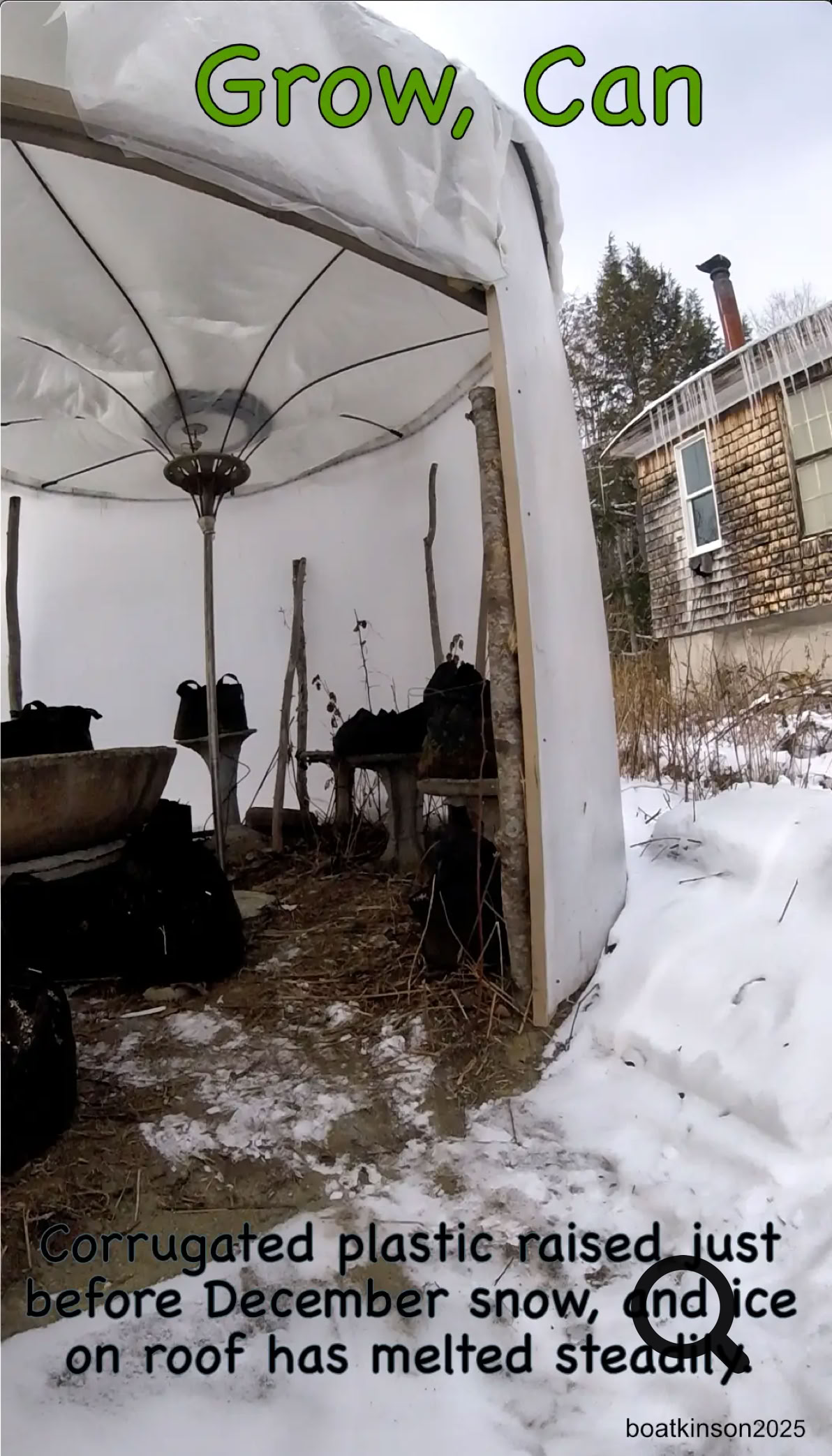 Some poles were placed around the base perimeter for initial bracing, but are not roof bearing poles. Woods and a big hill are nearby to provide some shelter from strong winds, but more bracing could possiblly be added. It stands to reason that corrugated, thin, curved, sheets can bear some ice and snow, but storms are watched closely here, and the punctured roofing drains heavy rain, for the soil irrigation.
